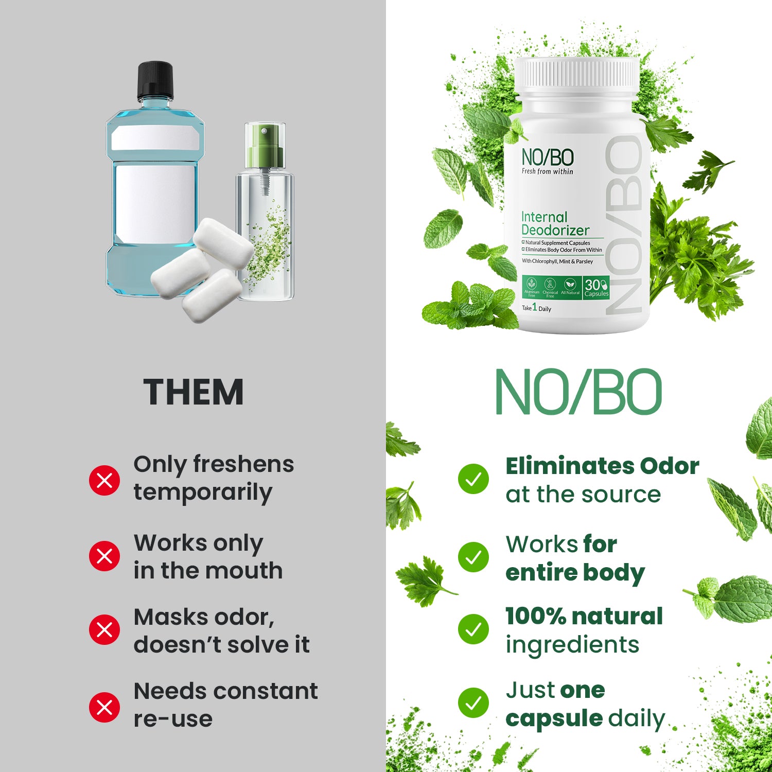 The ingredients in NO/BO have been used medically since the 1940s for internal body odor. They've been studied for decades. And when you combine them in the right doses specifically for metabolic odor from ketosis and high-protein diets, something pretty remarkable happens to your body's natural chemistry.